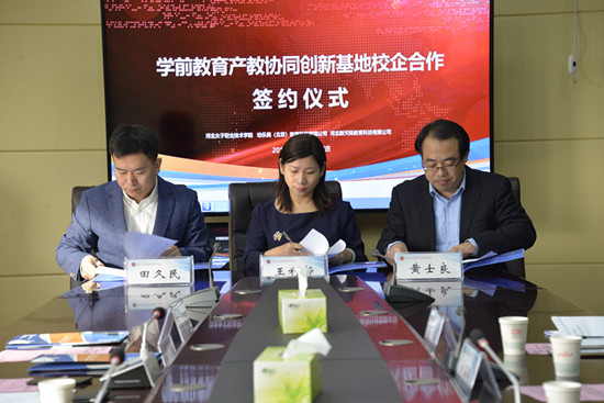签约仪式上,黄士良主任介绍了学前教育系发展情况和专业建设情况;王利静总裁、田久民总经理分别介绍了各自企业的发展情况。随后,校企方双签署了产教协同创新基地校企合作协议并参观了校内协同创新基地。