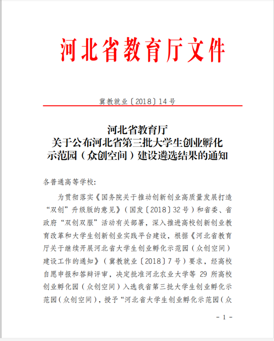 10月29日,河北省教育厅《关于公布河北省第三批大学生创业孵化示范园(众创空间)建设遴选结果的通知》(冀教就业〔2018〕14号)公布了河北省第三批大学生创业孵化示范园(众创空间)建设遴选结果。我院“毓秀空间”从全省120多所高校中脱颖而出,获批“河北省大学生创业孵化示范园(众创空间)”。