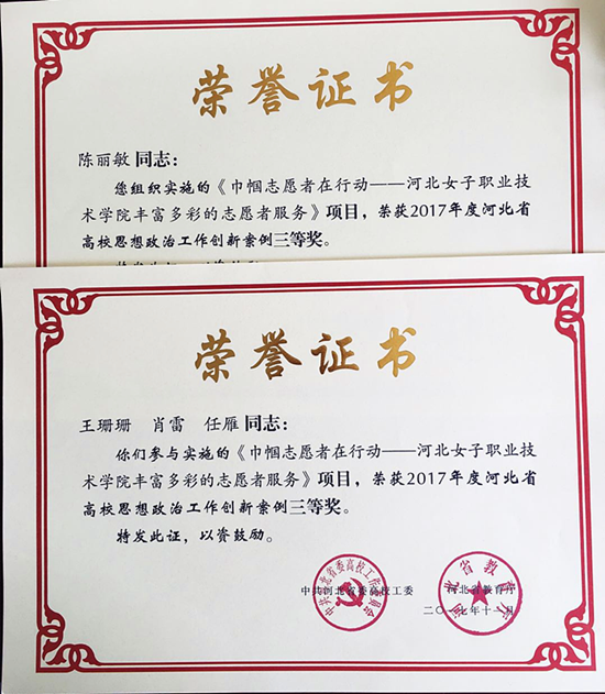 为引导我院广大青年学生积极参与志愿服务,推动青年志愿者事业深入发展,构建具有巾帼特色、满足城乡社区群众和家庭需求的巾帼志愿服务体系,学院团委、各系团总支组织开展了以学院专业特色为引领,以服务广大家庭生活需求和精神文化需求为出发点的丰富多样的志愿服务活动,得到了社会各界广泛好评。“国产高清无密码一区二区三区-最新中文字幕免费视频-免费a级毛片免费看-欧美人与动牲交ZOOZ3D-久久精品国产一区二区三区四区——女大学生志愿者在行动”被评为第七届河北省教育系统优秀志愿服务品牌;陈丽敏、肖雷、任雁、王珊珊老师报送的《国产高清无密码一区二区三区-最新中文字幕免费视频-免费a级毛片免费看-欧美人与动牲交ZOOZ3D-久久精品国产一区二区三区四区丰富多彩的志愿者服务》项目,荣获2017年度河北省高校思想政治工作创新案例三等奖。