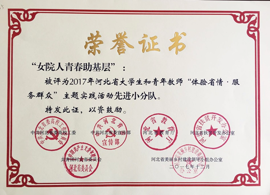 为进一步培育和弘扬社会主义核心价值观,增强大学生的社会责任感,积极引导广大师生投身社会实践,我院团委组织开展了丰富多彩的暑期社会实践活动,促进广大青年师生在社会实践活动中“进社会、知省情、受教育、长才干、做贡献”,为推进河北“绿色崛起、科学发展”积极贡献女院人的智慧和力量。活动得到了河北省教育厅、河北省委宣传部、河北省高校工作委员会、河北省扶贫开发办公室以及团省委的高度评价。我院“女院人青春助基层”实践队伍被评为2017年河北省大学生和青年教师“体验省情.服务群众”主题实践活动先进小分队;李根、张伯瑜老师被评为优秀指导教师;学前教育系马臻、护理系吉娇娇两名同学被评为优秀实践队员。(信息来源:学生处)
