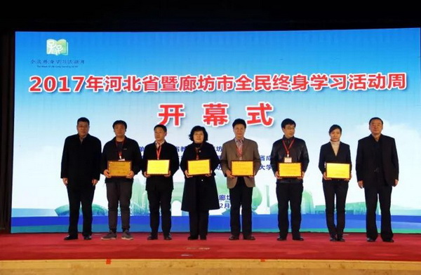 2017年12月6日,由河北省教育厅和廊坊市人民政府主办的“2017年河北省暨廊坊市全民终身学习活动周开幕式”在廊坊国际饭店隆重举行。开幕式展示了一年来河北省全民终身学习的丰富成果,表彰了全省遴选的20个“优秀成人继续教育院校”,其中有七所院校被授予“2017年国家级优秀成人继续教育院校(培训机构)”。我院分别荣获“2017年国家级优秀成人继续教育院校(培训机构)”和“2017年河北省优秀成人继续教育院校(培训机构)”光荣称号,我院继续教育部主任胡英娣参加会议并代表学院领奖。