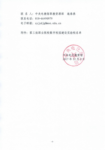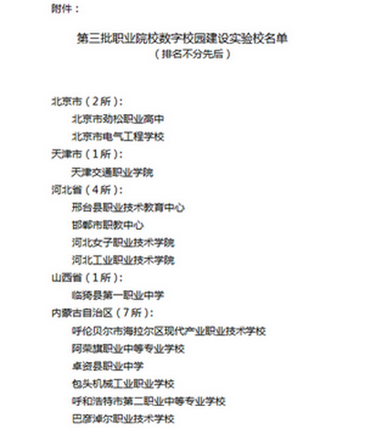 2017年6月,中央电化教育馆于下发了《关于遴选第三批职业院校数字校园建设实验校的通知》,得到各地、各院校积极响应。在职业院校自愿申报、省级教育行政主管部门和电教机构审核推荐基础上,中央电化教育馆组织专家对各院校申报方案进行了评审,最终确定了148所院校为“职业院校数字校园建设实验校”。