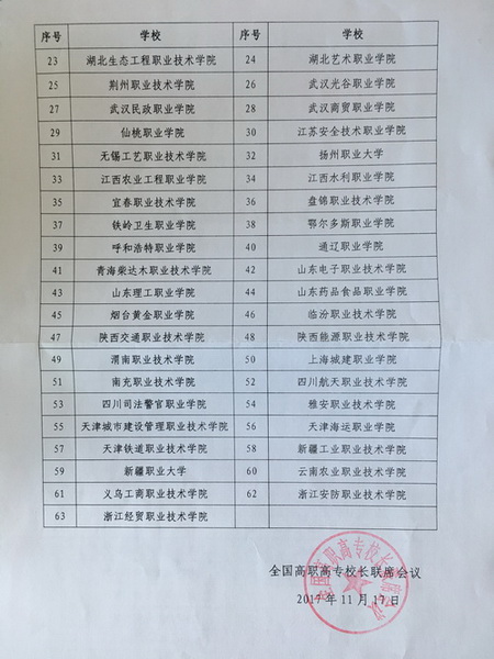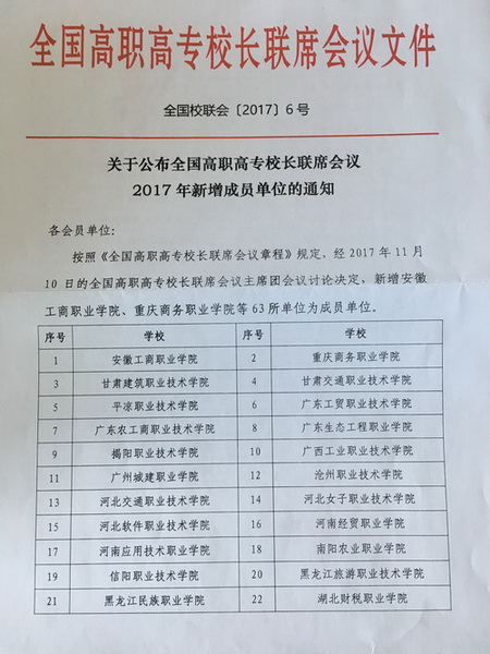 近日,全国高职高专校长联席会议下发《关于公布全国高职高专校长联席会议2017年新增成员单位的通知》(全国校联会[2017]6号),我院正式成为全国高职高专校长联系会议成员单位。