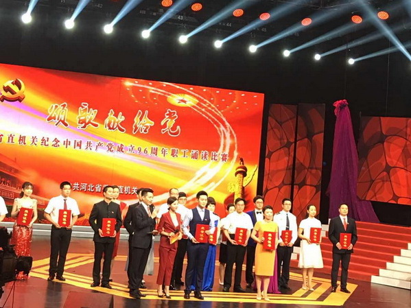6月30日下午,“颂歌献给党”—-省直机关纪念中国共产党成立96周年职工诵读比赛决赛在河北省广播电视台演播厅举行。我院由学前教育系魏娟娟老师、女性教育研究所胡婧超老师以及学前教育系40名学生组成的省妇联代表队荣获大赛二等奖;省委常委、宣传部部长田向利为获奖选手颁奖;省妇联主席贾玉英、学院院长盖春瑞、副院长董海鹰、副院长李彦琴到现场观看了比赛。