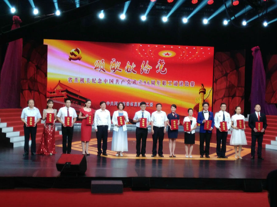 自今年5月省直工委开展此项活动以来,学院党委高度重视,以支部为单位组织开展学院职工诵读比赛,并推选出两名表现优异的教师参加省直工委复赛。我院教师不辞辛苦,带领学生加班加点排练,对作品不断提升,精益求精,最终从98个单位的108件作品中脱颖而出,成功入围决赛。30日下午的决赛中,学院师生团结一心,饱含深情地诵读了歌颂党和祖国母亲的作品--《我爱我的南方和北方》,赢得了现场观众的热烈掌声,最终荣获二等奖的优异成绩。