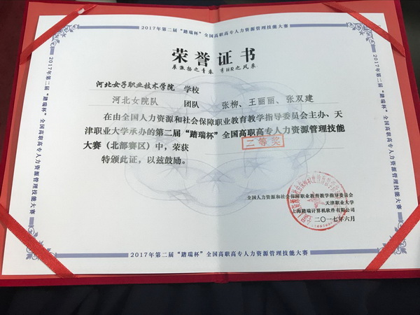 在为期一天的比赛中,共有来自全国11个省市的28支代表队,84名选手参赛。我院由经济管理系陈丽敏、张晓倩两位老师指导的人力资源管理专业张柳、王丽丽、张双建3名同学参加了比赛,经过综合实训、竞赛对抗两个环节的激烈角逐,我院代表队荣获团体二等奖,陈丽敏、张晓倩两位老师荣获优秀指导教师奖。