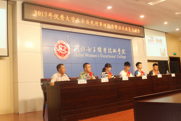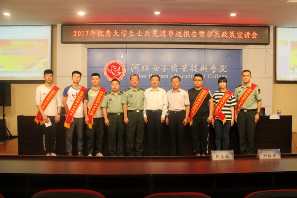 为深入贯彻落实习近平主席关于强军兴军的系列重大战略决策,引导激励更多高素质青年、高校学子参军入伍, 6月7日下午,我院举办了“2017年桥西区优秀大学生士兵先进事迹报告暨征兵政策宣讲会”,学院党委副书记柳韶军、学生处处长胡会来、桥西区武装部副部长韩卫旭、军事科科长康建树出席活动,各系学管干部和300余名学生到场聆听了宣讲会。
