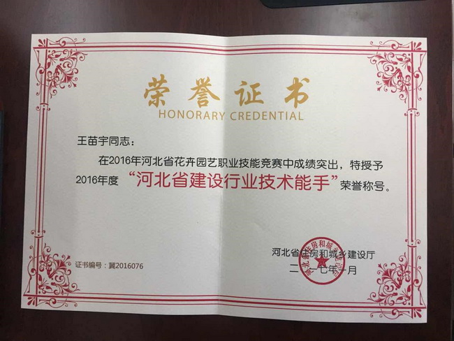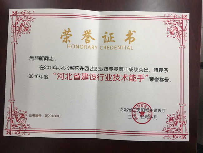 2016年9月24日,现代服务系选派园艺技术专业比赛团队参加了由河北省住房城乡建设厅、省林业厅、省人力资源社会保障厅、共青团河北省委联合举办的“2016年河北省花卉园艺职业技能竞赛”。经激烈角逐,董祯老师荣获“优秀指导教师奖”; 2015级园艺技术专业王苗宇同学荣获学生组二等奖、焦喆昕同学荣获学生组三等奖,两名同学分别获得“河北省建设行业技术能手”荣誉称号。近日,赛事组织部门向我院下发了获奖证书。本次比赛充分展示了我院师生良好的精神风貌和扎实的专业技能,将推动园艺技术专业发展建设再上新水平。