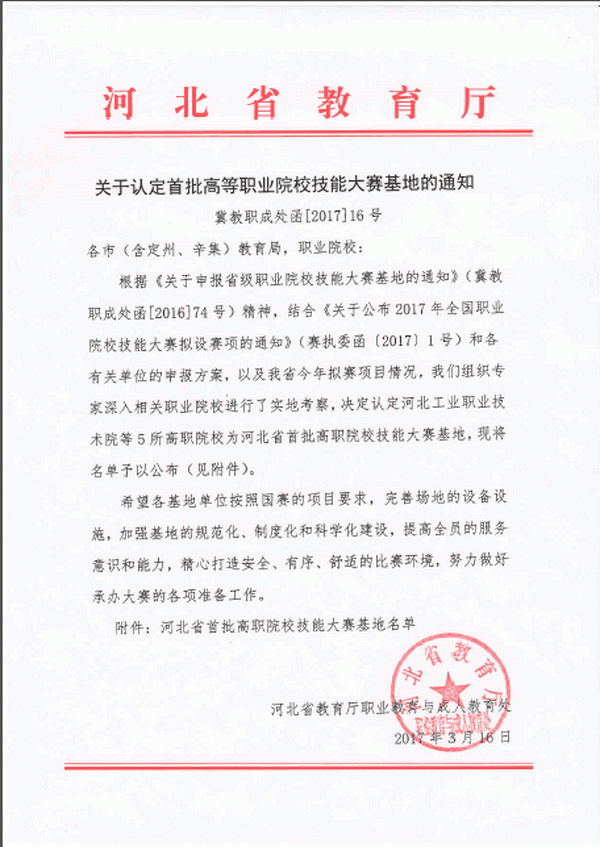 依据省教育厅《关于认定首批高等职业院校技能大赛基地的通知》(冀教职称处函[2017]16号)文件精神,我院被认定为首批高职院校会计技能大赛基地。