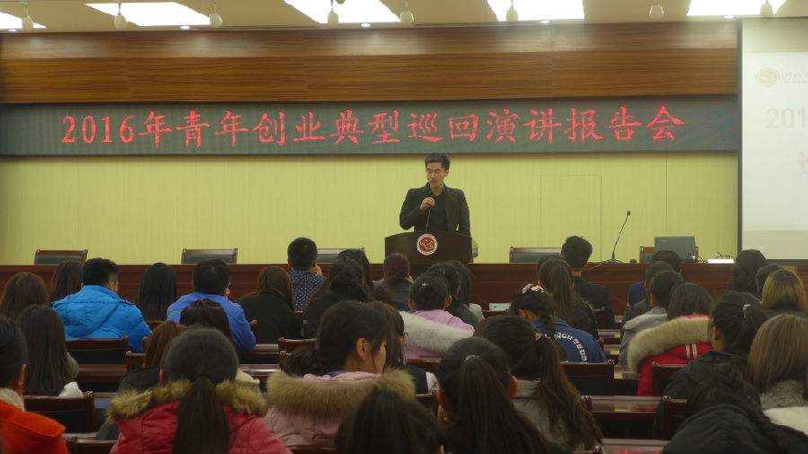 11月11日,由河北省人力资源和社会保障厅、共青团河北省委联合主办的“河北省2016青年创业典型演讲报告会”在我院新思维交流中心举行。省人力资源和社会保障厅石蕃同志带领包括我院2014届毕业生李文峰在内的7名青年创业成功典型代表到我院做事迹报告。学院副院长徐爱新、创新创业学院常务副院长孙彩虹和全院200余名师生一起聆听了报告。