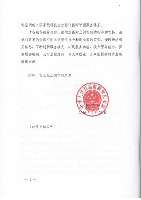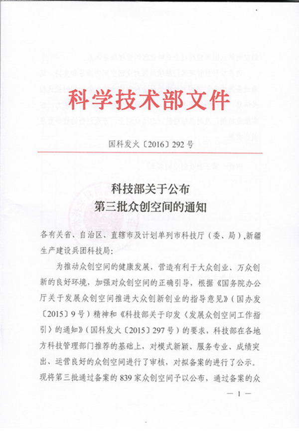 根据《国务院办公厅关于发展众创空间推进大众创新创业的指导意见》(国办发[2015]9号)精神和《科技部关于印发<发展众创空间工作指引>的通知》(国科发火[2015]297号)的要求,科技部在各地方科技管理部门推荐的基础上,对模式新颖、服务专业、成绩突出、运营良好的众创空间进行了审核、公示,并于近期正式公布了第三批通过备案的839家众创空间,我院“毓秀”空间名列其中。至此,我院“毓秀”空间正式纳入国家级众创空间管理序列。