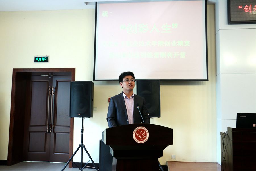 石家庄市就业服务局纪学宏副局长代表市就业服务局讲话。他阐述了当代大学生创业的重要作用和意义,对我院“创彩人生”创新创业训练营的开营给予热烈的祝贺和充分的肯定。他指出,石家庄市就业服务局非常重视青年特别是在校大学生的创新创业工作,就业服务局将积极为有意创业的青年铺路搭桥、排忧解难,提供资金和政策支持,做好保障工作。同时,他也希望各位同学增强担当意识和实干意识,珍惜学习机会,不断提高自身能力,不断坚持创新,进而实现自己的创业梦想!