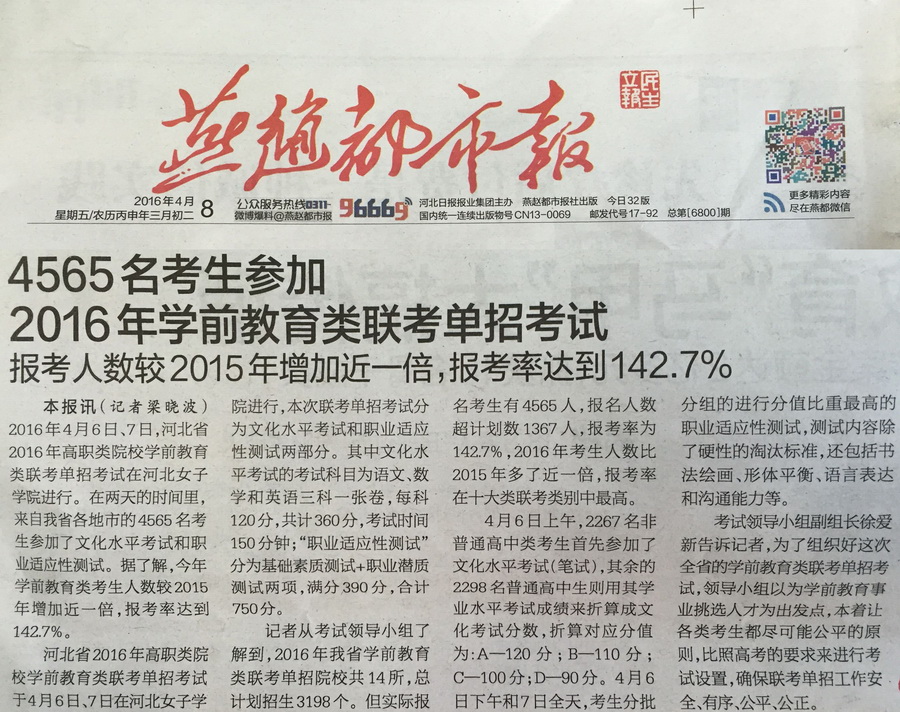 2016年4月8日,《燕赵都市报》报道了由我院牵头组织,14所高职院校联合举行的2016年河北省高职(专)院校学前教育类联考单招工作的新闻。