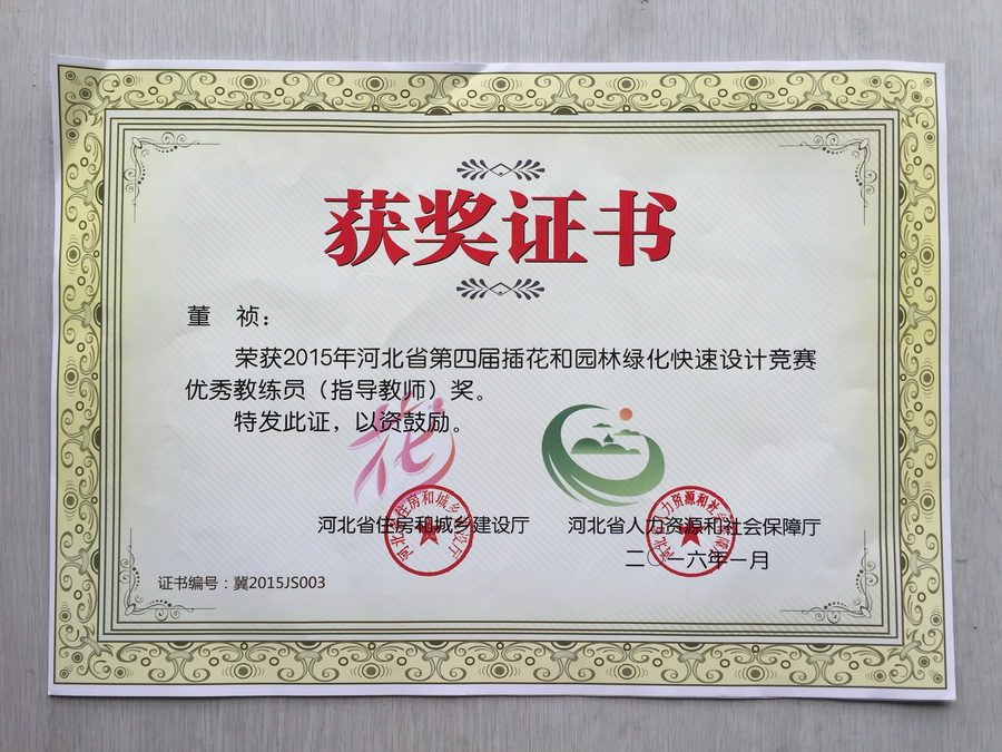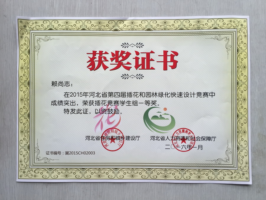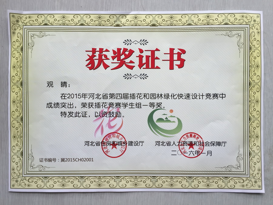 由我院现代服务系园艺技术专业董祯老师指导的2014级观晴、赖尚志等6名同学在“河北省第四届插花竞赛决赛”中喜获佳绩。观晴、赖尚志同学分别荣获学生组第一名与第三名的优异成绩,并获得“河北省建设行业技术能手”荣誉称号;董祯老师荣获“优秀指导教师奖”。本次比赛充分彰显了我院园艺技术专业师生扎实的专业功底!