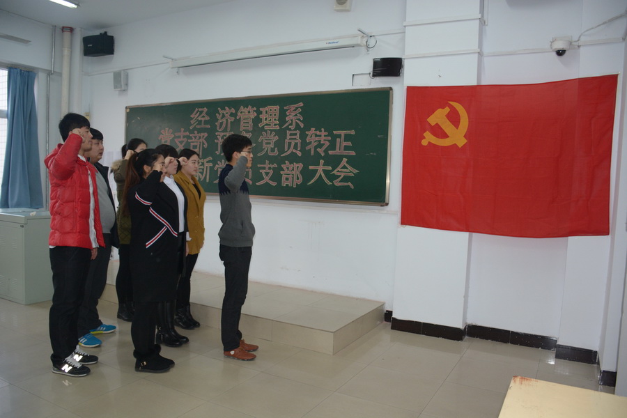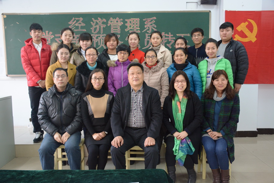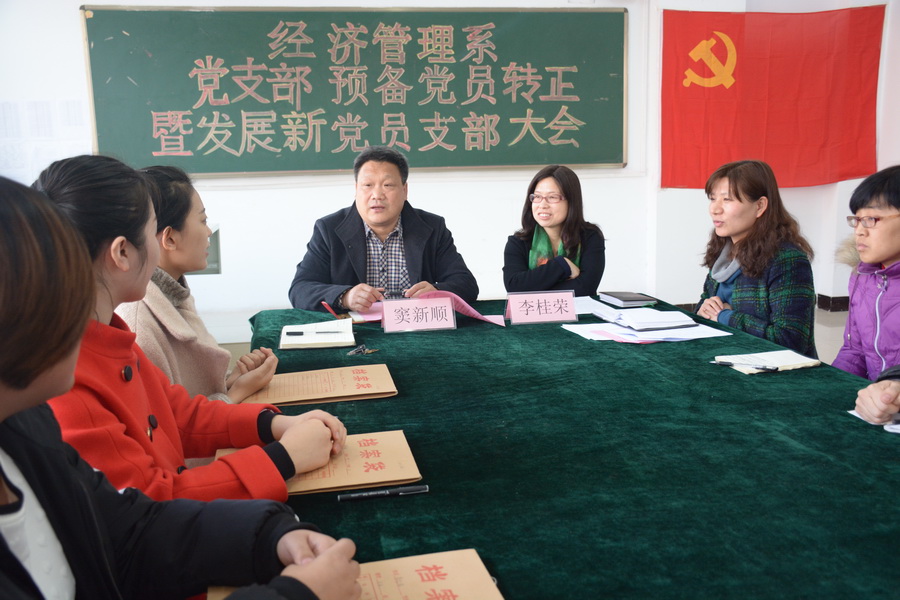 2015年12月18日下午,经济管理系党支部在综合教学楼610教室召开了预备党员转正暨发展新党员支部大会。学院党委书记窦新顺、经济管理系党支部书记李桂荣出席了大会,经济管理系党支部全体党员参加了会议,会议由经济管理系党支部组织委员陈丽敏主持。