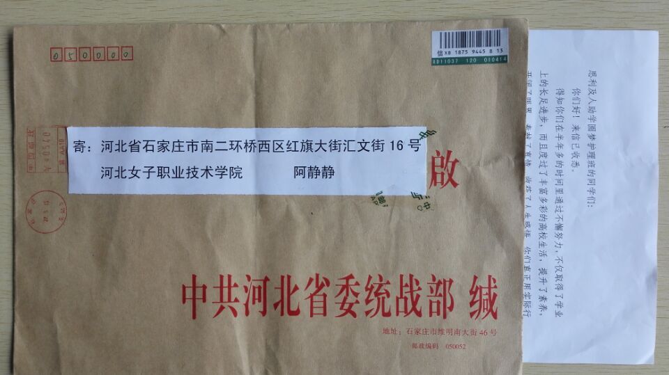 青春的梦想展翅飞翔,希望的曙光熠熠生辉。2015年5月4日,我院护理系思利及人助学圆梦护理班以班级名义向省委统战部、省妇联、无限极(中国)有限公司、燕赵都市报、河北人民广播电台等长期关心关注助学班的领导和老师寄出感谢信。5月28日,收到了省委统战部领导和老师的回信。