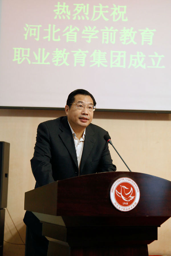 省教育厅副厅长贾海明做重要讲话。他指出,成立河北省学前教育职教集团,是贯彻落实国务院《关于加快发展现代职业教育的决定》的重要举措,也是我省加快现代职教体系建设的新途径、培养高素质劳动者和技术技能人才的新模式和激发职业教育办学活力的新举措。他要求新成立的学前教育职教集团把握发展机遇、勇担责任使命,在创新人才培养模式、整合优质教育资源、打造职教品牌上下功夫。他勉励学院发挥好牵头单位的核心引领作用,最大限度地实现集团单位办学和经营的经济效益、社会效益,促进成员单位的互助互利、合作共赢、科学发展,促进我省学前教育事业持续健康发展。