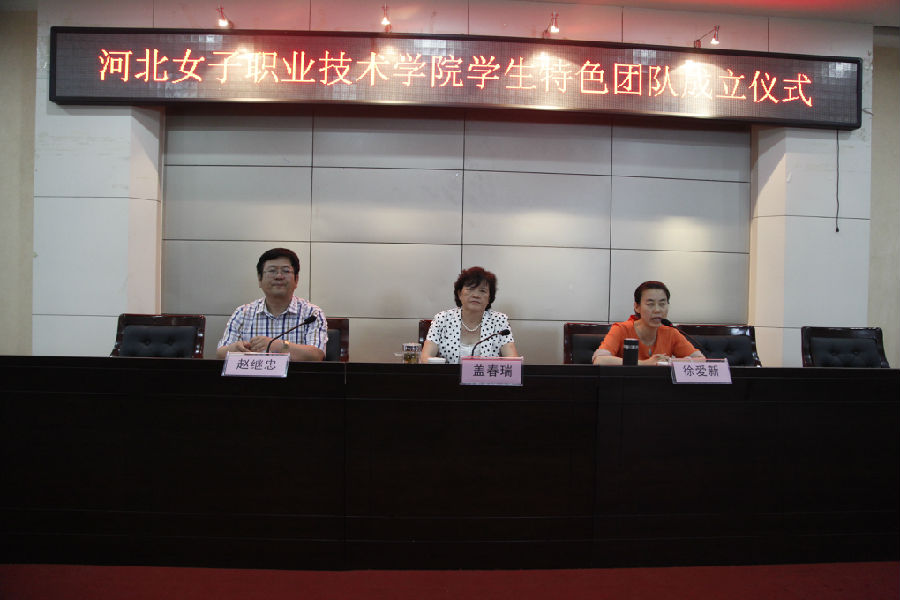 成立仪式由徐爱新副院长主持。会上,教务处长赵继忠介绍了学院特色团队的活动方案。护理系同学马晓琳代表特色团队的学生队员发言,她表示作为团队的一员要听从老师辅导,努力训练、不断提高自身综合素质,在保证正常学业的同时为学校争得荣誉。特色团队教师代表赵如山随后发言,他在发言中表示一定要做好团队辅导工作,让学生们能够在团队活动中学习如何提高个人综合能力,同时也要做好本职的教学工作,不断提高个人教学水平。之后,盖春瑞院长发表重要讲话,她首先对在团队筹备过程中做出了努力和贡献的老师和同学表示感谢和慰问,并充分肯定了学生特色团队成立的重要意义,提出现在学院的教育不仅只局限于教学,还要不断提高学生的综合素质。盖院长对特色团队的辅导教师和学生分别提出了具有针对性的要求,希望特色团队在老师的辅导和学生的共同努力下越来越好。徐爱新副院长最后做了总结发言,她强调了学生特色团队成立的重要意义以及团队发展的目标和方向,希望团队成员努力训练,在个人素质提高的同时为校争光添彩。