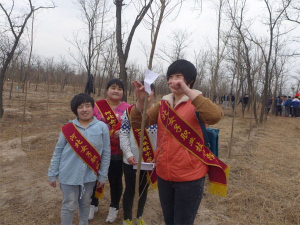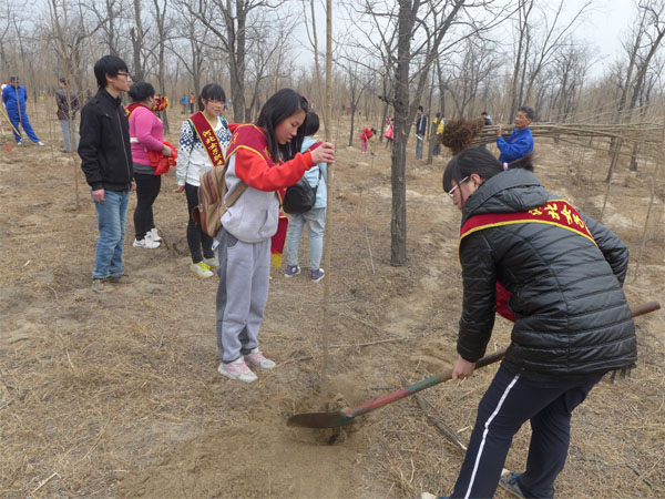 3月12日一早,同学们准时出发,前往小壁林林场。经过一个小时的车程,小壁林到了。下车后,小壁林区顿时热闹起来,放眼望去,到处人头攒动,旗帜飘扬,参加植树造林的人们都干得热火朝天。志愿者们分工明确,秩序井然,挖坑、搁苗、培土、踩实、浇水,每一个环节都做得十分认真。春风中的寒意丝毫没能减弱年轻人火热的激情,不到一个小时大家就种下了三十余棵树苗。最后,大家写下自己美好的祝愿,挂在了刚刚种下的小树上。