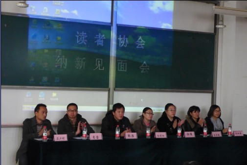 2013年11月13日,大学生读者协会纳新见面会在图书馆楼107教室隆重举行。出席本次大会的嘉宾有各系特聘教师:艺术设计系副主任孙彩虹老师、经济管理系团总支书记陈丽敏老师、应用技术系团总支书记任雁老师、社工系团总支书记张浩老师、护理系团总支书记肖雷老师,读者协会指导老师苏少彬老师及赵琳捷老师。读书协会2012级理事会全体成员、2013级读者协会全体新成员参加了见面会。