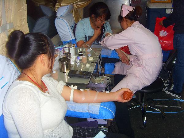 秋日的下午,阳光明媚,同学们怀着激动心情在献血车前排起了长队。参加献血的同学每人填写了“无偿献血登记表”,医生对每一位献血者进行了简单的询问和检查,并交代了注意事项。当鲜红的血液顺着塑料管流出的时候,同学们心中的紧张瞬间转化为自豪,大家的脸上洋溢着幸福温暖的笑容。