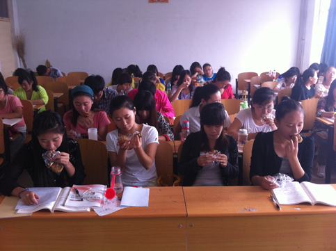 上午8时,由各班班长在系领导那里领取属于各班的月饼,一箱接一箱沉甸甸的,尽是温暖。当班长们抱着月饼走进教室的一刹那,同学们欢呼雀跃,看到月饼就像看到家一样,充满喜悦。人手两个,刚拿到手中便迫不及待的张嘴就咬,你是枣泥的、我是豆沙的、她是哈密瓜的,你一口我一口,扎堆的私语,满足的笑容……看到这画面,任谁都忍不住微笑。