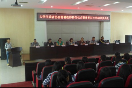为了加强读者协会与各系的交流与联系,提高读者协会理事会成员的能力与水平,我院大学生读者协会特聘任数名指导教师帮助协会发展。2013年9月23日,大学生读者协会在报告厅举行了大学生读者协会特聘指导教师聘任仪式暨暑期征文活动颁奖典礼。读者协会代理会长李谱主持,图书馆李馆长、馆内2名指导教师赵琳捷、苏少彬及读者协会理事会成员及部分会员参加了此次典礼。
