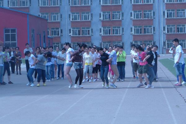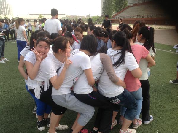 同学们参与活动的热情像今天的阳光一样火辣,有激情。“步调一致”作为第一个项目拉开了本次活动的序幕,“梦想长城”的自我介绍、队员之间的支持鼓励以及“行进坦克链”、“倒跑接力”的团队协作等多个团体活动是今天的主要内容。在活动中,大家兴致高昂,每个参与到其中的同学都积极的为活动的顺利完成献计献策,12市场开发与营销专业团队虽然在“行进坦克链”项目途中屡次踩破道具,但她们没有泄气,粘好坦克链继续前进坚持到最后,用信心和队员的合作完成了挑战。尤其是在最后一个活动“我们在一起”12市场班组织最得力。说明她们在活动前做好了充分的准备。