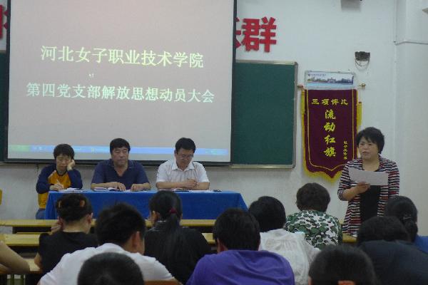 首先,党支部副书记赵继忠同志带领与会人员认真学习了学院党委书记王静同志题为《统一思想明确任务 以思想大解放推进学院大发展》的重要讲话。王书记的讲话重点强调我们要统一思想,提高认识;结合我院实际,围绕“学院发展”、“办学特色”、“人才培养模式”、“执行力”、“服务社会能力”五个方面开展大讨论,进行深入研究,重点突破;要强化责任,务求实效,将本次大讨论活动与自己的本职工作相结合,提出有效措施,力求各项工作都有新突破。支部纪检委员董彦菊主同志宣读了学院关于开展“解放思想大讨论”活动的通知,宣传委员郑瑞新同志宣读了第四党支部“解放思想大讨论”活动计划安排。