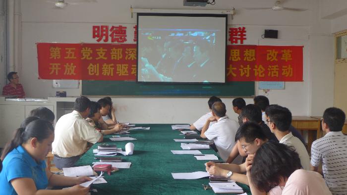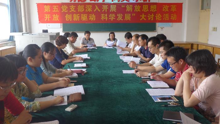 根据学院党委深入开展大讨论活动实施方案的安排部署, 2013年5月23日下午,第五党支部在综合教学楼502教室召开“解放思想、改革开放、创新驱动、科学发展”大讨论学习活动,副院长柳韶军同志出席学习活动并做重要讲话,支部全体教职员工参会。会议由第五党支部书记李桂荣同志主持。