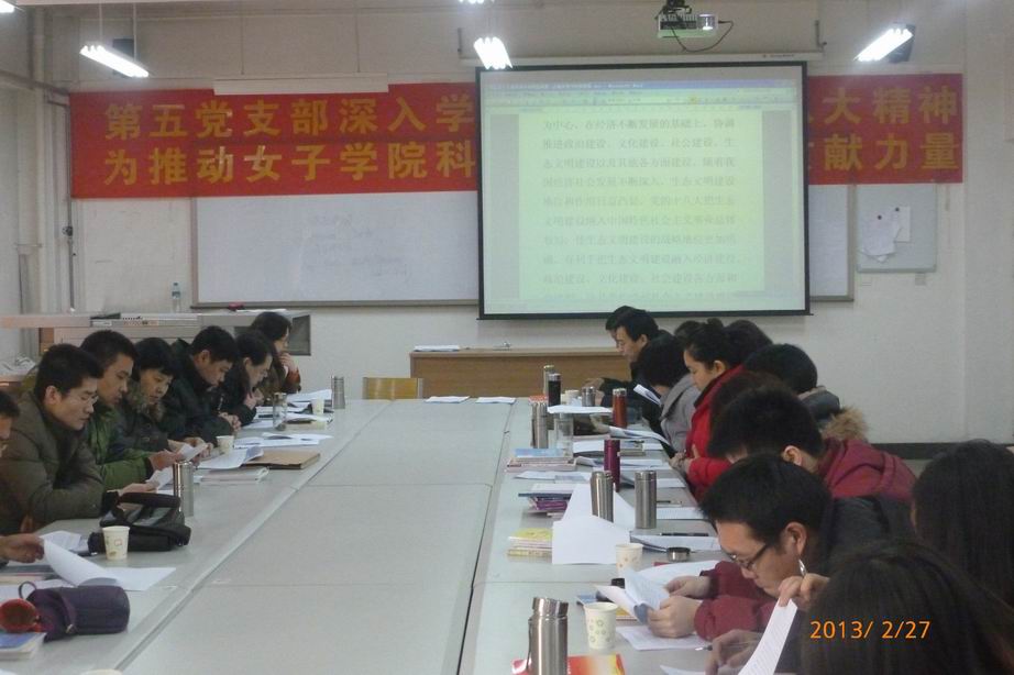 根据学院党委关于开展学习党的十八大精神活动的安排部署,2013年2月27日,第五党支部在实训楼603教室组织全体支部成员进行了第二个学习日的集中学习。