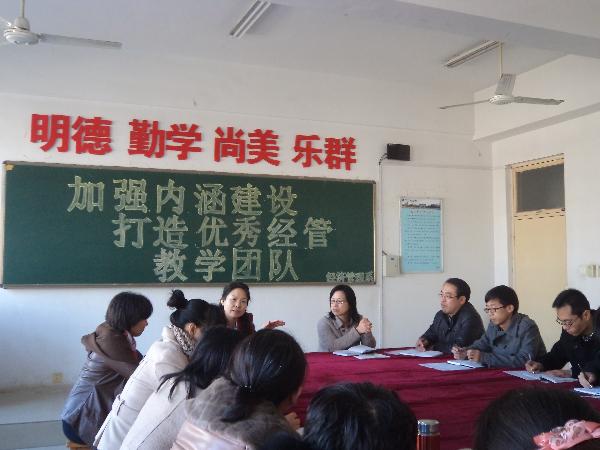 最后,李桂荣主任代表经济管理系全体教师感谢王书记的激励,要求全系教职工对王书记的讲话内容要认真思考、理解、反思,对照国家级优秀教学团队的基本要求,查找自身团队建设的不足,明确建设的目标与方向。李主任表示,在学院领导的指导和激励下,经济管理系一定会打造出一支德清业精、求实创新的经管教学团队,推动经济管理系各项工作健康有序开展。