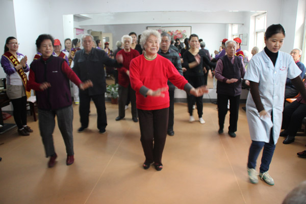 同学们的到来受到了付院长和老人们的热烈欢迎。活动中,同学们先到老人们房间看望了各位老爷爷、老奶奶,陪他们聊天,帮他们收拾屋子。随后,志愿者们为老人们献上了精心准备的节目,表演独舞《咏荷》的同学舞姿优美,轻盈曼妙;葫芦丝演奏《月光下的凤尾竹》音色轻柔细腻,圆润质朴;豫剧《花木兰》唱腔雅致俏丽,韵味十足……老人们听得兴致昂扬,为我们表演了他们活力十足的健身操《最炫民族风》、《套马杆》,并和志愿者们一起合唱了《夕阳红》,整个老年公寓充满了欢声笑语。两个小时的时间很快就过去了,志愿者们和老人合影留念,老人们依依不舍的把大家送到了楼梯口,与志愿者们挥手告别。