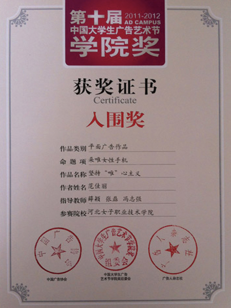 2012年2月,艺术设计系2009级电脑艺术设计专业学生范佳丽在专业教师冯志强、张磊、薛颖的带领下参加了目前国内唯一由国家工商总局批准、中国广告协会主办的,主题为“我创意 我行动”的《第十届中国大学生广告艺术节学院奖》大学生广告艺术大型活动,并获得入围奖。