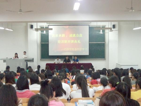 2012年9月18日晚,由经济管理系《经管学刊》主办的“追求卓越,成就自我”为主题的培训班开班典礼在图书馆206教室如期举行。团总支书记陈丽敏老师、教学秘书康江卫老师、报刊指导老师于立强老师、就业指导员李佳老师、学生会主席冯柳阳同学、《经管学刊》主编杜香同学、副主编郭亚静同学以及《经管学刊》全体成员出席了本次活动,2012级全体新生参加了此次开班典礼。