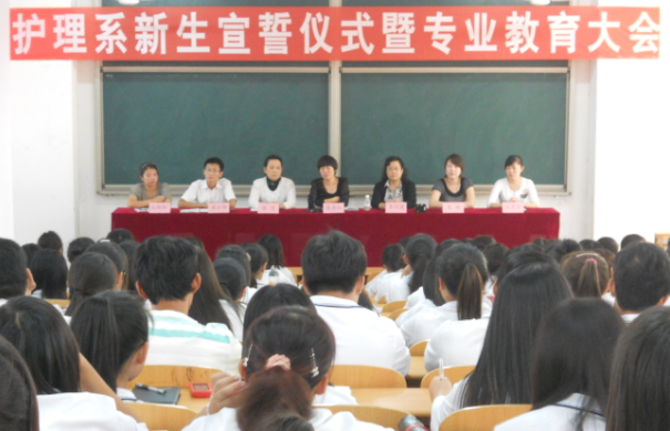 2012年9月16日下午2:30,护理系在106阶梯教室举行新生宣誓仪式暨专业教育大会,出席会议有护理系副主任秦秀红老师、河北省三院原护理部主任李同建老师、白求恩国际和平医院原妇产科护士长张进老师、护理实训中心马晓卿老师及2011届、2012届毕业生代表王文学、栗娜。会议由护理教研室主任梁冰锋老师主持。