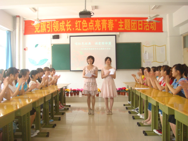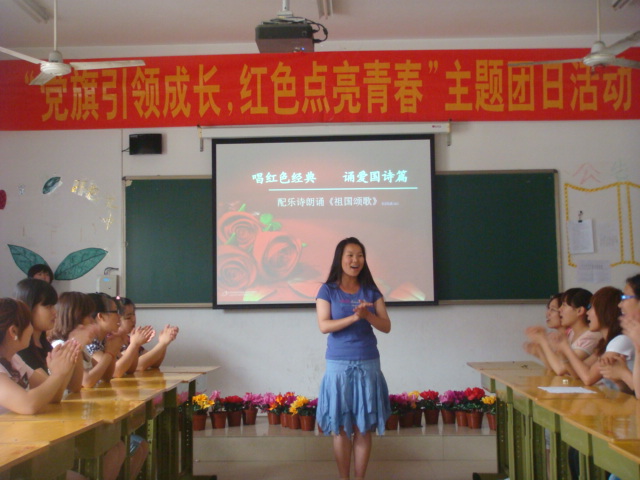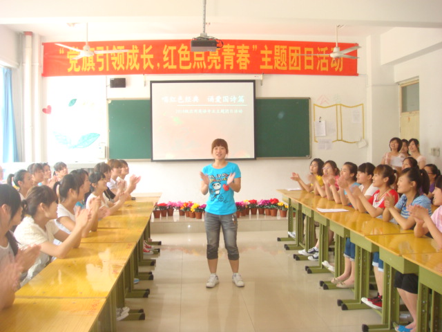 本次团日活动立意新颖、形式活泼、教育效果突出。包括红色歌曲独唱、合唱、配乐诗朗诵等学生喜闻乐见的活动形式。一曲《没有共产党就没有新中国》的歌声中拉开帷幕。配乐诗朗诵《颂歌献给党》、《祖国颂歌》等深深地表达了大家对党和国家的赞美之情。歌曲《爱我中华》表达了五十六个民族紧紧团结在党的周围,万众一心,共创祖国美好的明天的坚定决心。刘婷同学带领大家唱响《走进新时代》,把整个活动推向高潮。