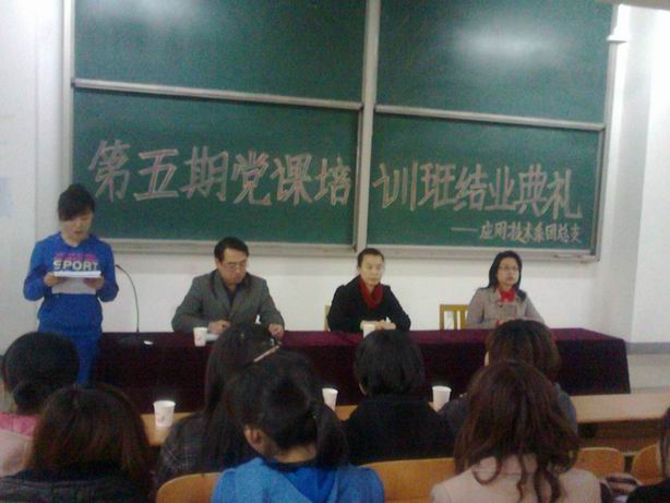 3月18日下午4:00,应用技术系第五期入党积极分子培训班结业典礼在图书馆107教室举行。学院党委委员、第二党支部书记徐爱新同志、应用技术系李桂荣副主任、团总支书记黄士良同志 出席了结业典礼,应用技术系辅导员和全体培训班学员参加了此次典礼。本次典礼由应用技术系团总支书记黄士良同志主持。