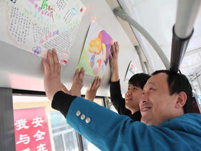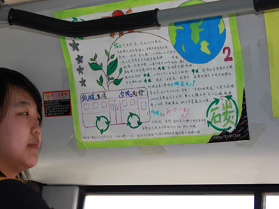 艺术设计系的青年志愿者们,利用课余时间亲手绘制了五十余张以“绿色环保,低碳出行”为主题的手工海报,并与公交公司的职工一起将其中的三十五张海报装饰在13路公交车上,以倡导广大市民从自身做起、从现在做起、从乘坐公交车开始,坚持绿色出行,共同营造我们美好的绿色家园。张贴了我院艺术设计系志愿者们亲手绘制海报的13路公交车,连续运营了两天。本次活动已被石家庄电视台“民生关注”栏目予以报导。
