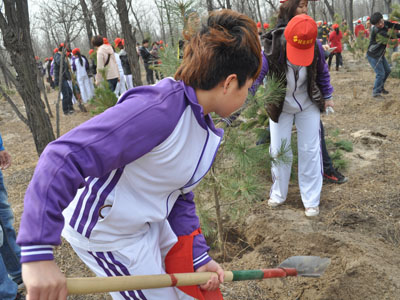 3月19日早晨七点半,我们坐着大巴准时出发了。这一天虽然刮起了阵阵寒风,但却难以阻挡同学们“义务植树,美化家园”的火热心情。上午9时许,小壁林到了,志愿者们一下车就立即接过铁锹和树苗兴致勃勃地开始植树。今天的小壁林区异常热闹,放眼望去,满眼人头攒动,旗帜飘扬,参加植树造林的人们都干得热火朝天。志愿者们抡起了铁锹,挖坑、搁苗、浇水、培土,干得十分起劲。他们从植苗、培土、踩实到浇水,精心栽植,细心呵护着每一棵幼苗,每一个环节都做得十分认真。
