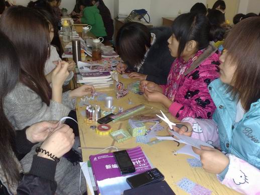 活动开始,主持人宣布活动的目的并向大家介绍活动的意义,然后向大家介绍每个组的购置品。之后,宣布活动开始,并开始号召大家行动起来。有的制作“心愿风铃”、有的制作“笔座”、“杯桶”、有的制作了一些礼物包装盒……随后,邀请的嘉宾来到活动的现场,并参与到其中,整个活动的气氛很是融洽。最后,四十分钟的制作环节过去后,主持人开始让大家分组展示自己的作品,大家一一介绍着自己本组的作品的意义,活动在主持人的总结中宣布结束。