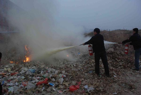 石家庄家安防火中心的教官利用多媒体课件对与会人员进行了生动的消防知识培训。最后在南校区模拟火场,与会人员亲自动手学会了使用灭火器灭火的方法。