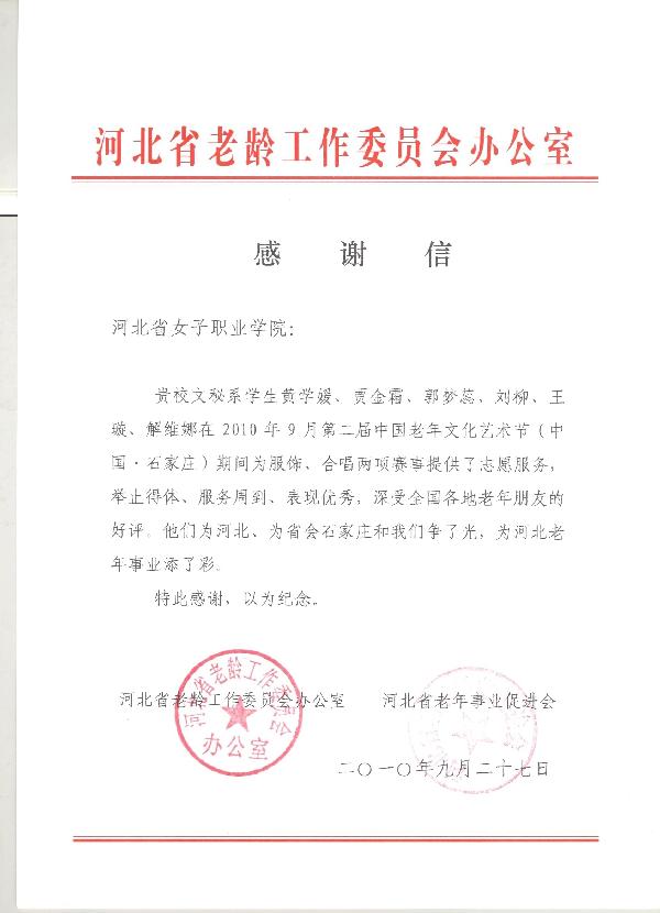 9月日至27日,第二届中国老年文化艺术节在省会石家庄隆重举行,我院社会工作系黄学媛、贾金霜、郭梦蕊、刘柳、王璇、解维娜六名同学参加了此次艺术节的志愿服务工作。他们勤恳、敬业、辛勤的工作态度得到了艺术节组委会领导、河北省老龄工作委员会办公室领导和河北省老年事业促进会领导的肯定和赞许,为学院争得了荣誉!