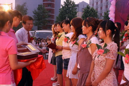 盛典的第一项环节是2010届毕业典礼。王振杰院长首先宣读了《关于2010届1509名毕业生准予毕业的决定》,并亲自向毕业生代表颁发了毕业证书和象征事业顺利、家庭和睦、爱情甜蜜的幸福花环;柳韶军副院长为“省、校两级优秀毕业生”和“优秀实习生”代表颁发了荣誉证书;王静书记发表了热情洋溢的致辞,向圆满完成学业,顺利毕业的1509名毕业生表示热烈的祝贺,向精心育才、辛勤付出的教职员工表示衷心的感谢。同时,她希望广大毕业生能够传承中华民族传统美德,践行社会主义核心价值体系,胸怀使命,志存高远,在不断奋进中实现自己的人生价值,并鼓励同学们树立终身学习的理念,勇于克服困难,锤炼意志、历练品德,真正成为脚踏实地、勤于学习、善于创造、甘于奉献的有用之才。