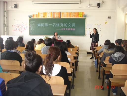 张文静女士热情的向同学们介绍了办公室工作的主要内容,并根据自已二十多年的工作经验,结合实际的案例,就如何写好文字材料、如何组织会议、如何做好接待工作、如何进行单位档案管理及上述各项具体工作对人员在素质、能力的要求进行了深入的讲解。此外,张文静女士还特意强调“好习惯与阳光心态”对做好文秘工作的重要性,并指出要当一名好助手需注意的事项:一头脑反应要快、办事要迅速;二不要搬弄是非;三忌多头请示、越级请示;四要具备很好的保密意识;五不要自命清高;六要加强协调能办;七要保持良好的心态;八要注意单位形象的宣传。报告结束后,张文静女士又与学生进行了互动交流,对同学们提出的问题进行了详细的解答。讲座在同学们热烈的掌声中结束。