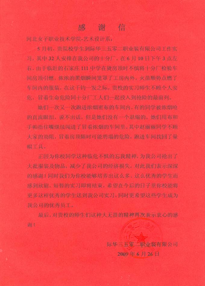 际华三五零二职业装有限公司致艺术系感谢信