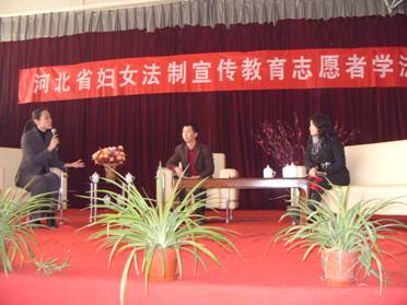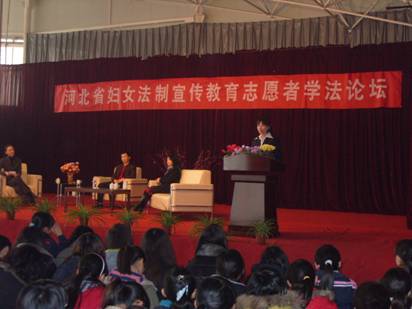 为了构建社会主义和谐社会,努力推进我省妇女事业的繁荣发展,提高全省妇女的维权意识、弘扬社会正气、倡导社会公平,同时为了深入开展“维护妇女合法权益,共同促进科学发展”为主题的河北省“三八”维护妇女合法权益宣传周活动, 3月3日,“河北省妇女法制宣传志愿者”学法论坛在我院隆重召开。本次活动由河北省妇联主办,河北省女子职业技术学院社会工作系承办。与会领导有学院党委王静书记、教务处徐爱新处长、办公室董彦菊主任、组宣部胡会来处长、社会工作系胡英娣主任以及应用技术系李志主任。石家庄十佳律师、河北佳园律师事务所主任王丹女士、河北省妇联权益部马立成先生作为特邀主讲嘉宾参与了本次活动。法律专业李佳老师主持了本次活动,全院师生共1000多人参与了本次论坛。