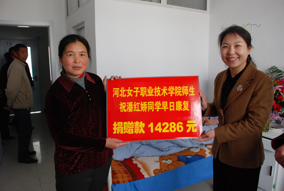 潘洪娇同学3月19日入院,经检查被诊断为红斑狼疮急性肾病综合症。若病情持续发展,将导致肾功能衰竭,患者会因尿毒症和身体各器官全面衰竭而死亡。此病的治疗需要昂贵的医药费,这对一个农民家庭来说无疑是巨大的灾难。艺术设计系得知情况后,系团总支向全系教师和学生发出倡议,号召大家:少吃一块雪糕、少去一次网吧、少逛一次街,节省零用钱,伸出援助之手,用爱心来挽救这个鲜活的生命。倡议书发出后,学院领导、老师和同学们、学院食堂和部分社会人士均伸出援助之手,迅速掀起了一股献爱心热潮,十天的时间募集到爱心款14286元。学院领导对此事非常重视,党委书记王静与艺术系老师们一起前往医院看望潘红娇同学。