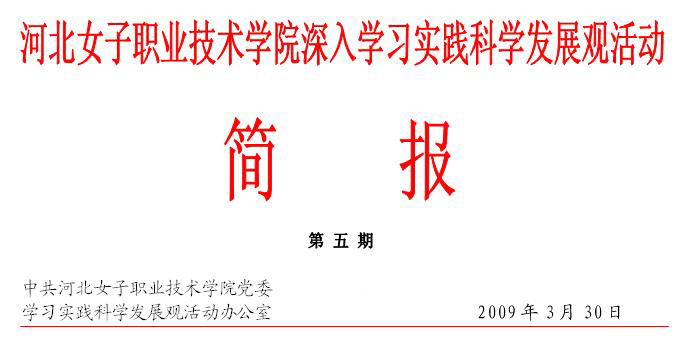 根据《中共河北省委关于开展深入学习实践科学发展观活动的实施意见》和省高教工委关于开展深入学习实践科学发展观活动的安排部署,为营造科学发展观活动氛围,打造女院品牌,推进学院科学发展,学院党委研究确立了“创新思路求发展,科学管理上水平,以人为本促和谐”的活动主题,将教育教学、行政管理与科学发展融会贯通,进一步解放思想、改革创新,狠抓落实、突出实效、创新载体,彰显特色,使学习实践活动不断向纵深展开。