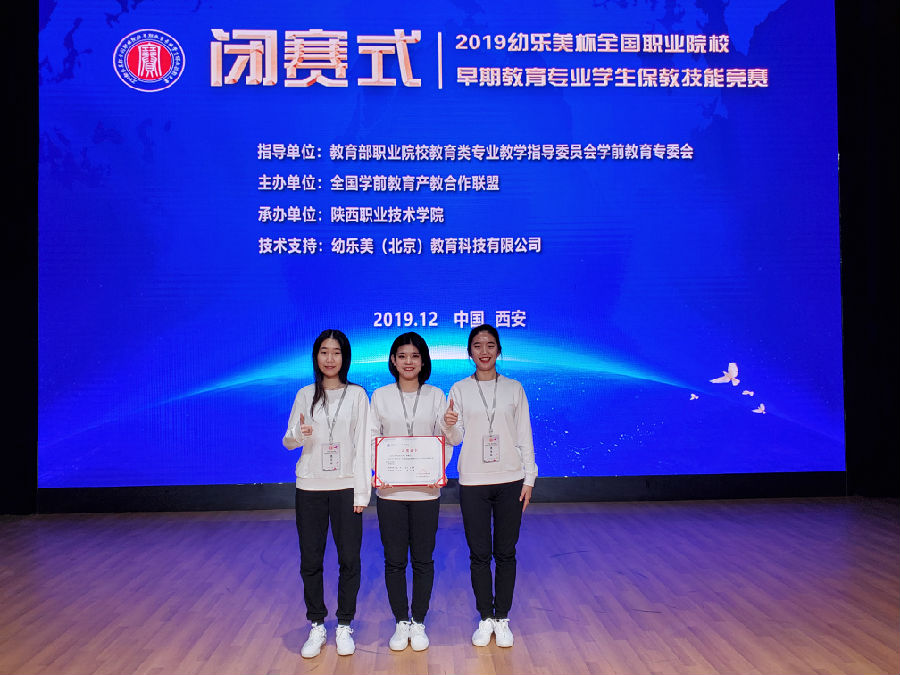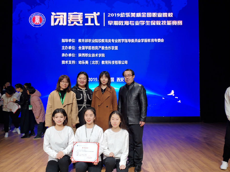 2019年12月20日-22日,由教育部职业院校教育类专业教学指导委员会指导,全国学前教育产教合作联盟主办、陕西职业技术学院承办的2019“幼乐美杯”全国职业院校早期教育专业学生保教技能竞赛在陕西职业技术学院举行。我院学前教育系主任黄士良带领刘乐天、鲍璐、王连悦三位老师与孟宇涵、王坤、王婷三位学生参加此次竞赛,取得国赛二等奖的优异成绩。此次大赛为期三天,包含7个赛项,共有全国23个省、市、自治区的69所院校参赛,近20所院校观摩,吸引了专家、学者等近600余人参加。